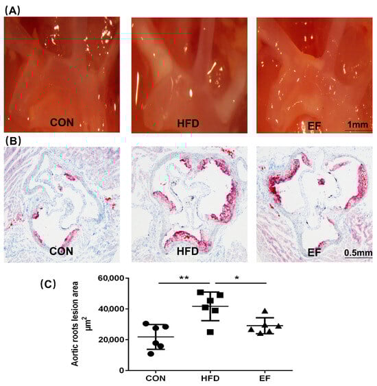(A) Representative ApoE−/− mice’s aortic arches and thoracic aorta were examined for white plaques using a stereomicroscope (SM). (B) Oil red O staining highlights plaques on the aortic roots. (C) Quantitative findings of atherosclerotic plaque regions in the aortic roots. CON, normal chow; HFD, high-fat diet plus PBS; EF, high-fat diet plus E. faecium NCIMB11508. The information is displayed as the average ± SD, with a sample size of 6, and * p < 0.05; ** p < 0.01.