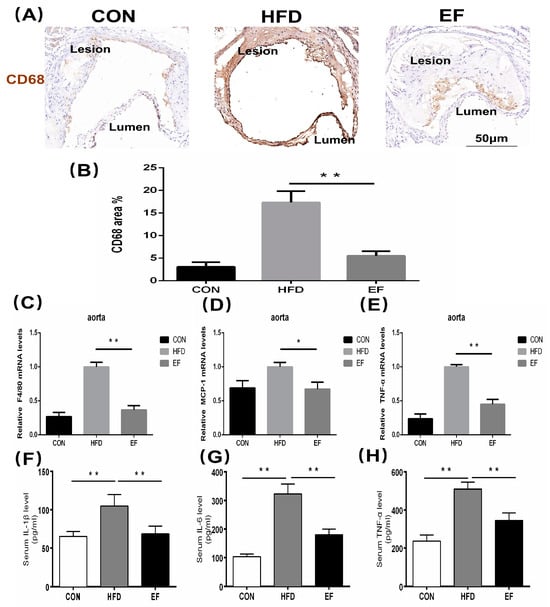 (A) Atherosclerotic lesions were detected with antibodies against CD68 and visualized by immunohistochemistry. Representative images from each group are shown. The area stained positively by CD68 (B) was determined as a percentage of the overall lesion area. The quantification of F4/80 (C), MCP-1 (D), and TNF-α (E) mRNA expression was performed in the aorta. The serum levels of IL-6 (F), IL-1β (G), and TNF-α (H) were quantified using ELISA.CON, normal chow; HFD, high-fat diet plus PBS; EF, high-fat diet plus E. faecium NCIMB11508. E. faecium NCIMB11508, 109 CFU/day, 12 weeks. The information is displayed as the average ± SD, with a sample size of 6, and * p < 0.05; ** p < 0.01.
