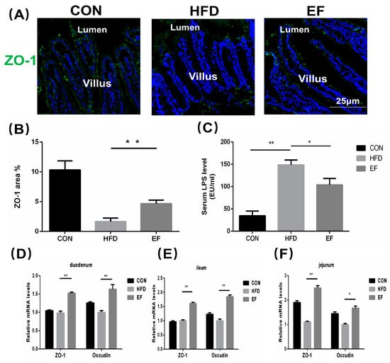 Immunofluorescent staining was used to visualize ZO-1 in the intestinal villi. (B) Images from (A) underwent a numerical evaluation. (C) Lipopolysaccharide content in the serum. The quantification of occludin and ZO-1 proteins’ mRNA expression was carried out in the duodenum (D), jejunum (E), and ileum (F). Representative images from each group are shown. CON, normal chow; HFD, high-fat diet plus PBS; EF, high-fat diet plus E. faecium NCIMB11508. The information is displayed as the average ± SD, with a sample size of 6, and * p < 0.05; ** p < 0.01.