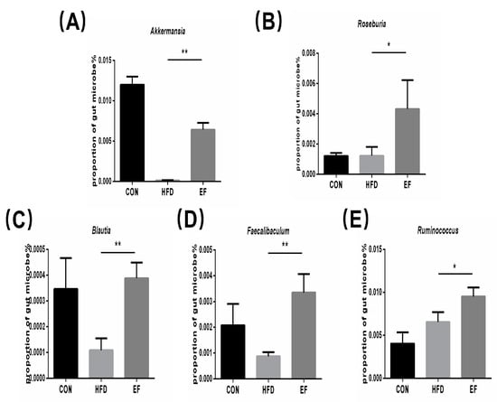 (A) The abundance of Akkermansia. (B) The abundance of Roseburia. (C) The abundance of Blautia. (D) The abundance of Faecalibaculum. (E) The abundance of Ruminococcus. CON, normal chow; HFD, high-fat diet plus PBS; EF, high-fat diet plus E. faecium NCIMB11508. The information is displayed as the average ± SD, with a sample size of 6, and * p < 0.05; ** p < 0.01.