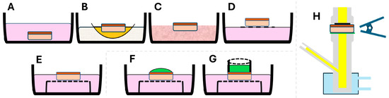 State-of-the-art ex vivo organ culture system development has employed various technical approaches so far, such as the plasma clot or watch glass method, the agar gel method, the raft method, and the grid method [20]. These techniques may be used for the ex vivo culture of epithelial tissues of different origins, such as intestine, upper respiratory tract, or skin, either in full contact with the nutrient medium or in partial contact, i.e., at the air–liquid interface (ALI), as schematically illustrated in Figure 1 [21,22,23]. Previous techniques for exposing tissue to external chemical stimuli have primarily relied on the droplet (Figure 1F) or cylinder ring methods (Figure 1G) [24]. Unfortunately, the droplet approach risks displacement during plate transportation, and its geometry may hinder uniform exposure across the tissue. Meanwhile, the cylinder ring method still carries the risk of movement on the epithelial surface, and the grease residue may affect tissue permeation. The commonly used Franz vertical diffusion chamber system for tissue permeability testing also has limitations, such as a high device-to-tissue volume ratio, requiring large tissue samples (diameter > 6 mm) that could unnecessarily damage and discomfort the donor area while also needing large volumes of culture reagents and space [25]. Therefore, the key challenge is to develop a reliable and reproducible system for exposing oral epithelial tissue to biomaterials and/or drugs through the epithelial barrier, followed by accessible post-analysis for permeation studies.