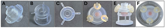 Photographs of the additively manufactured via stereolithography Epi-ExPer device. Upper (A) and lower (B,C) parts and the assembled device loaded with epithelial tissue (D,E) inside a 24-well plate (F).