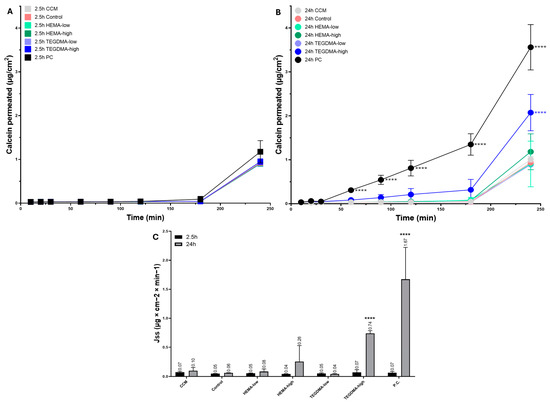 Permeation of calcein on porcine tissue loaded on Epi-ExPer device after 2.5 and 24 h of exposure to HEMA-low, HEMA-high, TEGDMA-low, and TEGDMA-high. Treatment with the resinous monomers under study after 2.5 h (A) and 24 h (B) and the Jss (C) for both time points are depicted. The CCM group was exposed only to the culture medium, and the control group was exposed to 0.025% EtOH/CCM, which is the diluent of HEMA and TEGDMA, while the positive control (PC) group was treated with 100° EtOH. Asterisks indicate statistically significant differences between the tested materials compared to the relevant control (**** p ≤ 0.0001).
