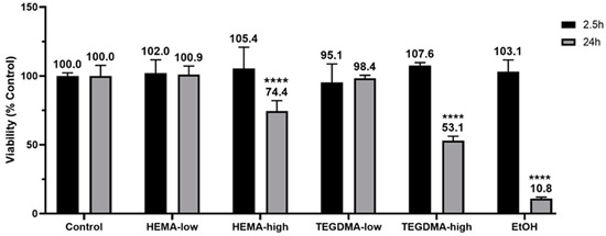Tissue viability (n = 3) after exposure to HEMA and TEGDMA for 2.5 h (black columns) and 24 h (gray columns). Mean values are annotated above each column, and asterisks indicate statistically significant differences between the tested materials compared to the relevant control (**** p ≤ 0.0001).