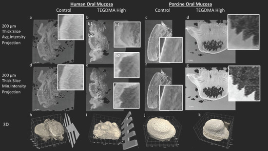 A comparison between the control and TEGDMA-high treatments for both human and porcine specimens indicates the influence of the chemical compounds on the epithelium; also see Supplementary Video S1. Additionally, the underlying deeply located connective tissue shows areas of lower attenuation, which result from the presence of loosely packed collagenous/fibrous tissue components and adipose tissue. These darker, lower-density areas are particularly apparent in the 200 μm average intensity projection and the minimum intensity projections across all TEGDMA-high samples.