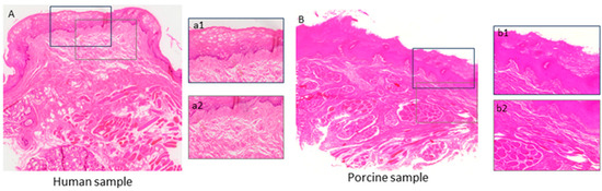 Whole-section histological scanning images of human (A) and porcine (B) oral mucosa specimens exposed to high concentrations of resinous monomers, which were previously scanned with the 3D X-ray μCT (Figure 6). The human mucosa exhibited severely altered cell morphology and cell damage due to extensive vacuolation in the upper two-thirds of the epithelium (a1). Similar, though less pronounced (covering only half of the epithelium), lesions were observed in the porcine epithelium (b1). In contrast, the underlying lamina propria was not substantially affected in either the human or porcine mucosa (a2,b2, respectively), and there were no significant alterations in collagen band density or tissue disruption.