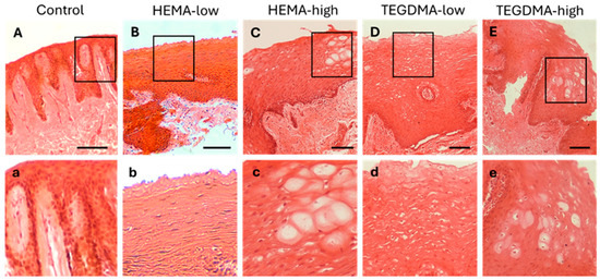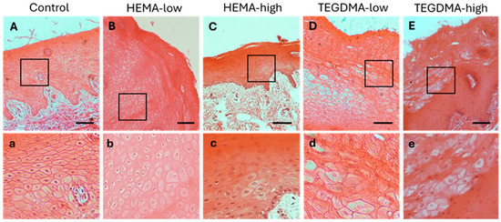 H&E photomicrographs of 10 μm human oral mucosa sections treated with 0.25% v/v EtOH in CCM (A,a), HEMA-low (B,b), HEMA-high (C,c), TEGDMA-low (D,d), or TEGMA-high (E,e). Treatment with HEMA and TEGDMA for 2.5 h resulted in severe disorganization of normal tissue architecture (C–E) with altered cellular morphology of epithelial cells (c–e). Vacuolar degeneration of epithelial cells was observed at high HEMA and TEGDMA concentrations (c,e) pointing to their dose-dependent effect, as higher concentrations of both resins resulted in more severe cellular and tissue damage. Scale bar = 100 μm.