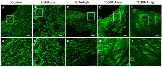 The observed effects on epithelial tissue were more evident with IF after staining with the pCK marker and visualization using CLSM (Figure 9). Specifically, the dose-dependent corrosive impact of HEMA and the even more pronounced effect of TEGDMA, causing severe disruption of epithelial architecture and induction cellular vacuolation, were clearly evident compared to normal human epithelial tissues.