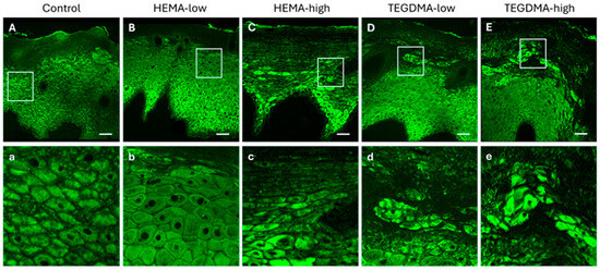 CLSM photomicrographs of 10 μm porcine buccal mucosa sections stained against anti-pCK. Oral mucosa specimens were either treated with 0.25% v/v EtOH in CCM (A,a), HEMA-low (B,b), HEMA-high (C,c), TEGDMA-low (D,d), or TEGMA-high (E,e). Treatment with HEMA and TEGDMA for 24 h resulted in epithelial atrophy (C–E,c–e), altered morphology of epithelial cells, and severe disturbance of epithelial architecture. TEGDMA induced a more severe effect on epithelial integrity, even at low concentrations (D,d). HEMA and TEGDMA’s effect on the integrity of oral epithelium was dose-dependent, as higher concentrations of both resins resulted in more severe cellular and tissue damage. Scale bar = 100 μm.