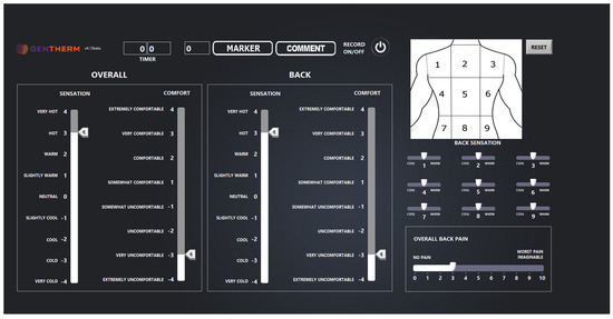 Alongside the measurement of skin and seat surface temperature during the test, participants were also asked to continuously report their subjective thermal comfort, thermal sensation, and pain responses on a tablet located directly in front of them. The subjective application interface is shown in Figure 1. They were instructed to record their overall thermal sensation and thermal comfort, as well as their local back thermal sensation and thermal comfort. The thermal comfort and sensation scales are based on the ISO 10,551 scales [21,22]. Before each test, participants were instructed to make changes to their subjective ratings whenever they felt the need, and were reminded that thermal comfort refers only to how comfortable the temperature of their back is, and to try to limit the impact of their back pain or the physical comfort of the seat on these measures. Also, on a 3 × 3 grid matrix of their back (see upper right section of Figure 1), participants were asked to rate if each grid on their back felt ‘cool’, ‘neutral’, or ‘warm’, in addition to their overall back pain on a 0 to 10 scale, where 0 and 10 were anchored with “No Pain” and “Worst Pain Imaginable”, respectively [23]. Participants could change their response freely and changes were made by moving the toggle on each scale. The subjective application was created using LabView (v.2021 SP1, National Instruments, Austin, TX, USA) and the data was continuously recorded at 10 s intervals.