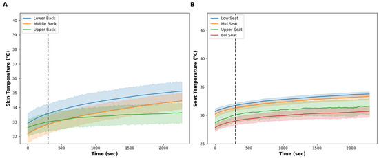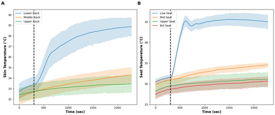 (A) shows the skin temperature at the low (blue line), middle (orange line), and upper (green line) back during the control condition. The vertical dashed line shows the onset of the test intervention. (B) shows the seat surface temperature at the low (blue line), middle (orange line), upper (green line), and bolster (red line) area of the seat during the control condition. The vertical dashed line shows the onset of the test intervention. Note the slight increase in skin and surface temperature from impaired heat dissipation due to the seat, even though the thermal effectors were turned off. The solid lines show the mean and the shaded areas are the standard deviation.