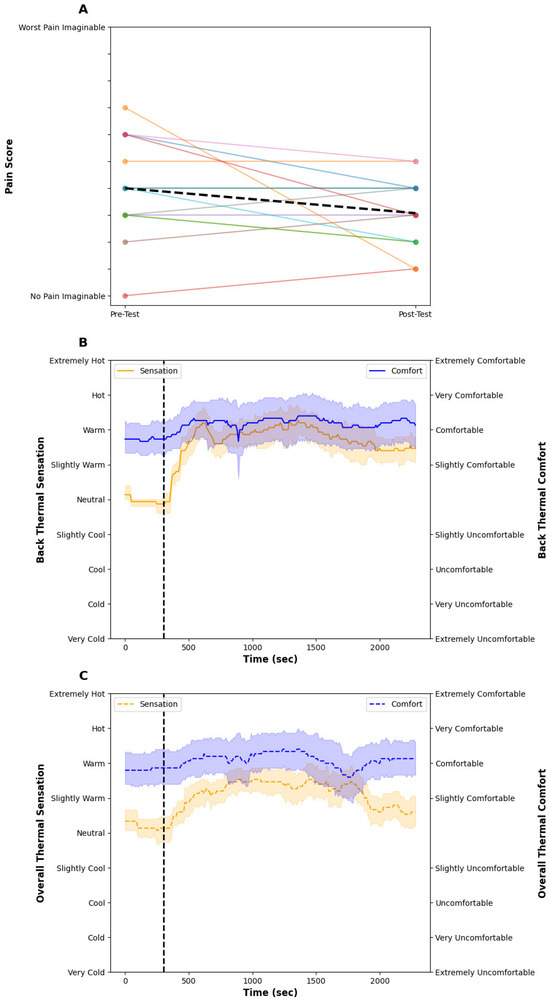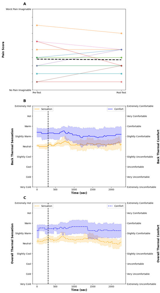(A) shows the individual pre and post-pain scores (colored lines) and the dashed black line indicates the mean group response. (B) shows the back thermal sensation (orange) and thermal comfort score (blue) during the control condition. The vertical dashed line shows the onset of the test intervention. (C) shows the overall thermal sensation (orange) and thermal comfort score (blue) during the control condition. The vertical dashed line shows the onset of the test intervention. The individual pain data shows most participants having a reduction in subjective pain from the heating intervention. Upon turning the thermal effectors on, local and overall thermal sensation increased to ‘warm’ and ‘slightly warm’, respectively, whereas thermal comfort was not impacted. The solid lines show the mean and the shaded areas are the SD.