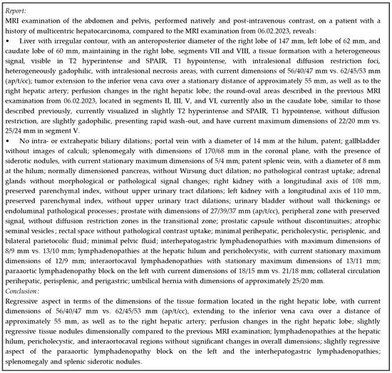 Radiology is an integral part of contemporary healthcare, offering essential diagnostic insights through advanced imaging techniques such as MRI and CT scans [1,2,3,4,5]. However, the interpretation of these images, involving the evaluation of complex patterns and abnormalities, is a time-consuming process, often requiring radiologists to spend between 10 and 30 min per report to provide comprehensive assessments. While the interpretation itself is the most critical aspect, the report that follows plays a key role in documenting these findings. The conclusions sections of these reports hold particular importance, as they synthesize detailed observations into actionable insights that directly influence patient management and therapeutic decisions [6]. The cognitive and analytical effort involved in image interpretation contributes significantly to the workload and pressure faced by radiologists, highlighting the need for solutions that support this process and enhance efficiency without compromising accuracy.