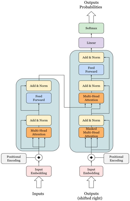 The Transformer architecture (Figure 2), introduced in “Attention is All You Need” [24], forms the backbone of modern natural-language-processing models, especially large language models (LLMs). Unlike recurrent neural networks (RNNs) and long short-term memory (LSTM) networks, the Transformer uses self-attention mechanisms to capture long-range dependencies in data. This feature allows for improved performance on tasks such as text generation and language understanding by enabling parallel processing of input sequences [25]. This architecture uses an encoder–decoder structure where both components consist of multiple identical layers. Unlike RNNs and LSTMs, which process tokens sequentially, the Transformer processes tokens simultaneously, leveraging multi-head attention for better parallelism and efficiency [26]. Each encoder layer consists of a multi-head self-attention mechanism and a position-wise feed-forward network, which ensures high computational efficiency and makes the model scalable on GPUs [27]. The decoder includes a masked multi-head self-attention mechanism, encoder–decoder attention, and a feed-forward network, enabling the model to handle various NLP tasks more effectively.