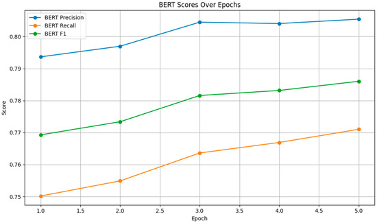 The BERTScore was evaluated in terms of precision, recall, and F1 score. As shown in Figure 4, the BERT precision, recall, and F1 scores improved steadily across epochs.