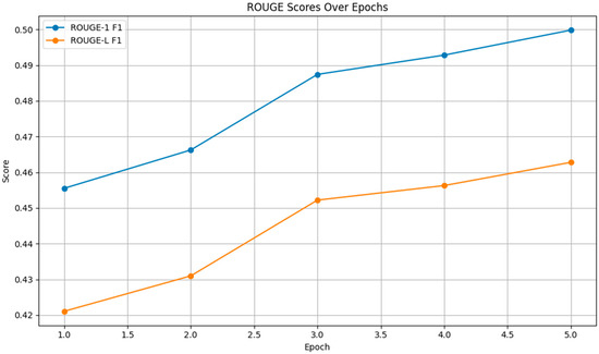As depicted in Figure 5, both the ROUGE-1 and ROUGE-L F1 scores increased across epochs, with ROUGE-1 F1 rising from 0.4555 to 0.4998 and ROUGE-L F1 increasing from 0.4211 to 0.4628. These improvements indicate that the model became better at capturing both individual words and longer sequences, enhancing the fluency and coherence of the generated text.