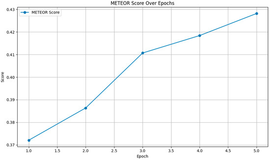 Figure 6 shows a steady increase in the METEOR score from 0.3721 to 0.4282 over the epochs. This upward trend indicates that the model’s outputs became increasingly aligned with the reference texts in terms of meaning and linguistic variation, demonstrating improved paraphrasing and synonym-matching capabilities.