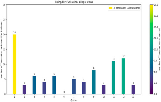 During the Turing-like test quiz, Doctor No. 6 was identified as an outlier, with the AI-generated conclusion being selected zero times in favor of the human-generated one. Initially, it was suspected that the AI might have underperformed on this specific dataset. However, analysis of the common questions revealed this was not the case, as other doctors selected AI-generated conclusions more frequently.