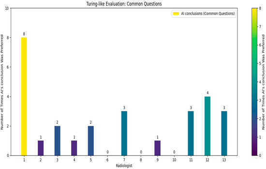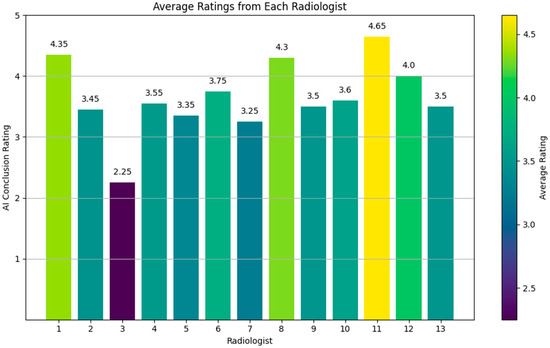 Overall, the average rating across all forms and questions was 3.65 (Figure 9), indicating a generally favorable reception of the AI-generated conclusions. This suggests that the AI is capable of producing quality conclusions that meet clinical standards. The high ratings on several forms (e.g., radiologists 1, 8, 11, and 12) further highlight the AI’s ability to generate conclusions closely aligned with expert-level interpretations.