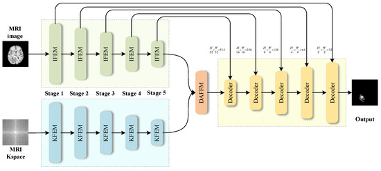 In the initial stage, the IFEM is responsible for the extraction of deep local feature information from MRI images. This module employs a CNN or Transformer structure, which is adept at capturing complex anatomical structures and pathological changes, thereby ensuring the effective extraction of local features in the image domain. In contrast, the KFEM performs deep global feature extraction from the K-space domain. This allows for the retention of comprehensive global information about the entire image, thereby preventing the loss of global features that would otherwise occur during down-sampling. The KFEM utilizes a complex convolution structure, specifically designed for the processing of MRI K-space data, which operates within the complex space. Subsequently, the DAFFM integrates the features extracted by the IFEM and KFEM. A dual-path attention mechanism is employed to effectively combine features with different attributes, allowing the model to focus on the most informative parts of the data. The fusion process enhances the representation of features, which ensures the comprehensive utilization of both local and global information. Lastly, the decoder module generates the final segmentation mask through the use of a residual skip connection mechanism.