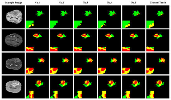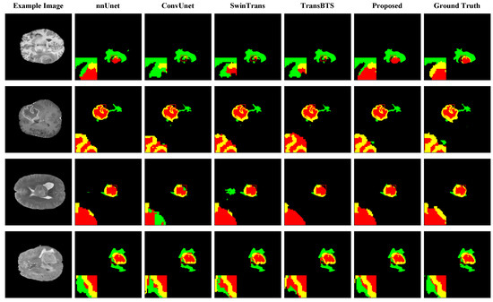 Figure 6 provides a visual comparison of brain tumor segmentation results obtained by different methods. Referring to the ground truth, the proposed method achieved more accurate segmentation results. The lower part of