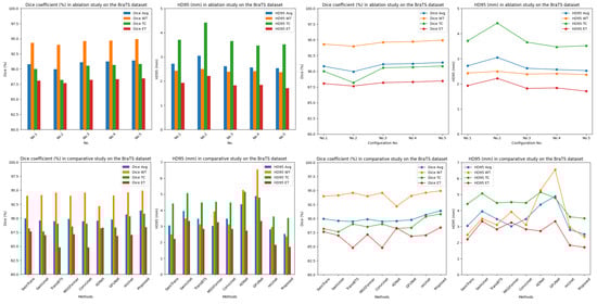 Figure 5 displays bar and line charts comparing the two evaluation metrics (Dice and HD95) of advanced methods, facilitating a more intuitive comparison of segmentation performance.