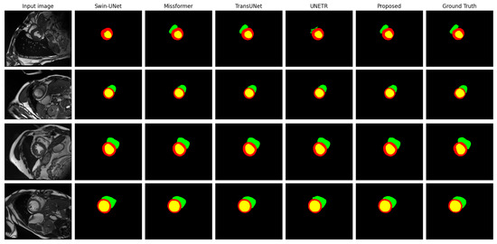 41]. The evaluation metrics used were the Dice coefficients (Dice %) for the left ventricle (LV), myocardium (Myo), and right ventricle (RV), as well as the average Dice similarity coefficient (Avg. Dice). To ensure a fair comparison, we trained and tested TransUNet, MISSFormer, Swin-UNet, and UNETR in the same local training environment. The quantitative results for U-Net++, nnFormer, and D-LKA Net were obtained from the original papers or the latest official published reports.