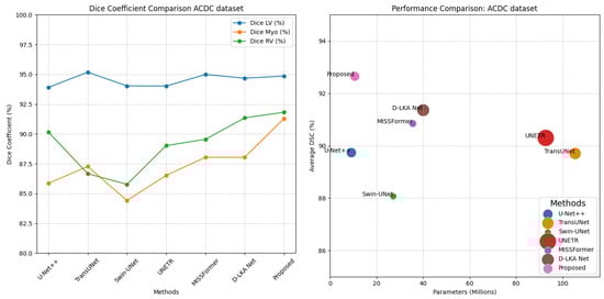 Figure 8 (right) presents a scatter plot illustrating the overall performance of various advanced MRI cardiac segmentation methods on the ACDC dataset. Specifically, the figure depicts the correlation between the number of parameters, FLOPs, and the average Dice score. Each method is distinguished by different colors, with the size of the dots representing their corresponding FLOP counts. As shown in the figure, the proposed method achieves superior MRI image diagnostic performance at relatively low computational costs, effectively indicating the method’s excellent performance in terms of algorithm complexity.