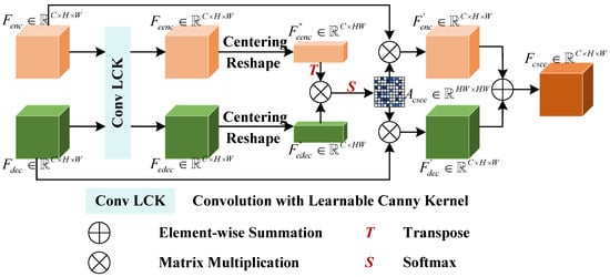 As shown in Figure 4, the proposed CSEE module is designed to bridge the gap between multi-scale feature maps in an encoder–decoder architecture. This module aims to preserve edge information across different resolutions and ensure consistency in boundary detection for segmentation tasks. In this section, we provide a detailed explanation of the CSEE pipeline, focusing on its multi-scale edge feature fusion and attention mechanisms. The CSEE module integrates edge information from both the encoder and decoder paths, ensuring that fine-grained boundary details are consistently represented across scales. It applies edge enhancement through a learnable Canny kernel and then computes spatial and channel-wise attention to align multi-scale features effectively.