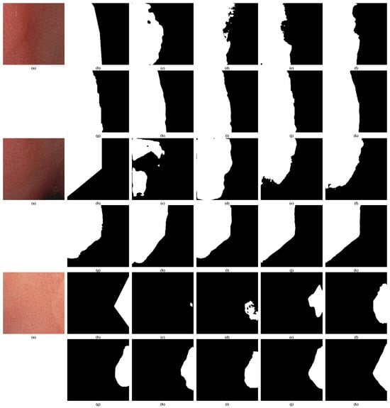 Visual inspections of random samples from CVC-ClinicDB test set. (a) Input image, (b) ground truth, (c) UNet [], (d) DeepLav V3+ [], (e) UNet++ [], (f) ResUNet [], (g) ResUNet++ [], (h) PraNet [], (i) XNet [], (j) Polyp-PVT [], and (k) EENet (ours).