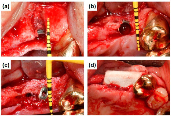 First-stage surgical procedures. (a) Peri-implant bone defect height, (b) peri-implant bone defect depth, (c) bone augmentation with BONE−D XB, and (d) application of Colla−DM.