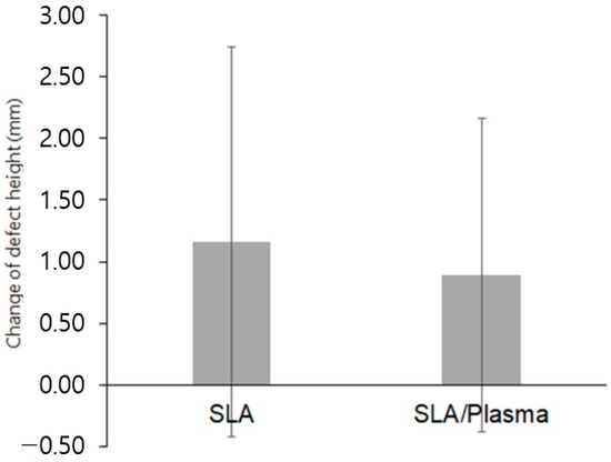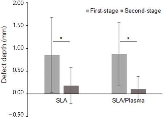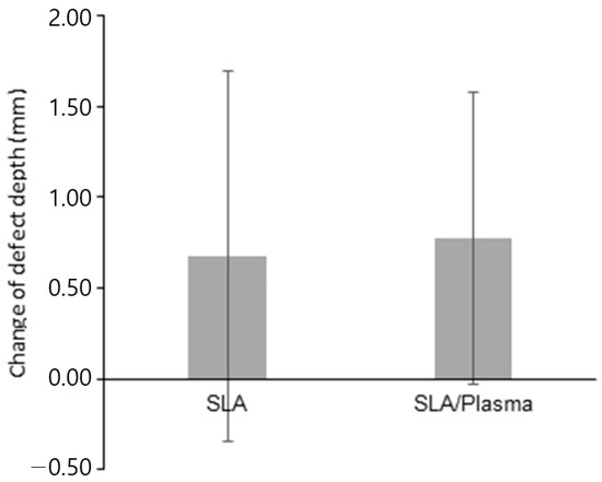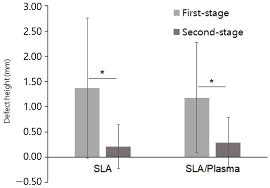The vertical height of bone defects in the first-stage surgery was 1.37 ± 1.39 mm (range 0.00 to 4.76 mm) in the SLA group and 1.18 ± 1.09 mm (range 0.00 to 4.22 mm) in the SLA/plasma group, showing no statistical significance (p = 0.839). In the second-stage surgery, the defect height was 0.21 ± 0.44 mm (range 0.00 to 1.53 mm) in the SLA group and 0.29 ± 0.51 mm (range 0.00 to 1.72 mm) in the SLA/plasma group, showing no statistical significance (p = 0.667). The changes in defect height in both groups were 1.16 ± 1.58 mm for the SLA group and 0.89 ± 1.27 mm for the SLA/plasma group, indicating no significant difference in buccal bone defect height between the two groups (p = 0.541). The Shapiro–Wilk test indicated a lack of normality. Therefore, the Mann–Whitney test was used for analysis. Both groups showed a decrease in buccal bone defect height from the first-stage surgery to the second-stage surgery, indicating vertical bone regeneration in both groups (Figure 4, * p < 0.01, Mann–Whitney test), even though statistical significance between the groups was not observed (Figure 4 and Figure 5 and Table 4).