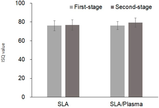 Similarly to the ISQ measurement results, the ISV measurement results showed no significant difference between the groups during the first-stage surgery (SLA: 67.25 ± 4.81, SLA/plasma: 69.61 ± 9.66, p = 0.352) or the second-stage surgery (SLA: 76.89 ± 7.27, SLA/plasma: 75.29 ± 7.19, p = 0.603). The change in ISV values also showed no statistical significance (SLA: 9.64 ± 7.28, SLA/plasma: 5.68 ± 10.84, p = 0.454) (Figure 10 and Figure 11 and Table 7).