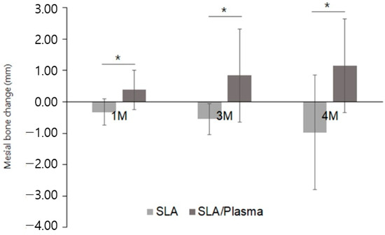 These findings suggest that marginal bone reconstruction was enhanced in the SLA/plasma group compared to the SLA group.