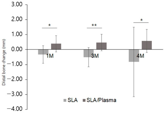 Similarly, the distal side bone changes exhibited significant differences between the groups at one month (SLA: −0.33 ± 0.59 mm, SLA/plasma: 0.39 ± 0.54 mm, p = 0.002), three months (SLA: −0.50 ± 0.64 mm, SLA/plasma: 0.46 ± 0.55 mm, p < 0.001), and second-stage surgery (SLA: −0.82 ± 2.32 mm, SLA/plasma: 0.58 ± 0.77 mm, p = 0.005). On the other hand, the changes over time within each group were similar (p > 0.05) (Figure 13, Table 9).