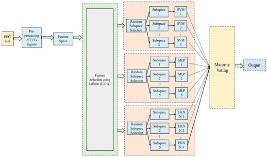 Only a small training inset has been utilized by most existing techniques, which does not match the high dimensionality of the problem. As a result, the feature-to-instance ratio becomes quite large. A low classification performance is obtained when training the classifier utilizing the small training dataset with high dimensionality. A novel classification method called the random subspace ensemble technique with SVM as the base classifier is proposed so that the computational load is reduced. The feature space is , and the mapping is found out by feature selection technique I-ICA. The random subsets in the feature space are utilized by random subspace, and the total subspaces are denoted by . On every subspace, the implementation of SVM classifiers is performed so that the input data can be classified. With the help of majority voting, the output with a large number of votes is selected. To prevent overfitting, which is caused by small size data and high dimensionality, ensemble learning schemes are considered instead of single classifiers []. The overall learning performance is improved, as these schemes provide a collective decision by weak hybrid classifiers. A random sample of features is used in the proposed random subspace ensemble technique, and the selection of features is made randomly and assigned to the classifier.