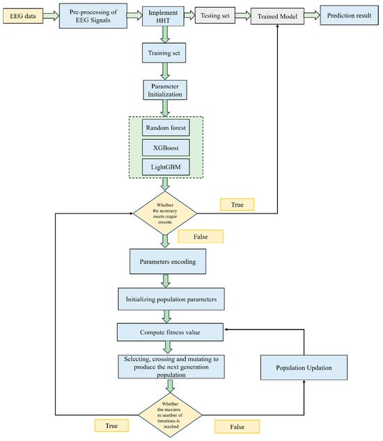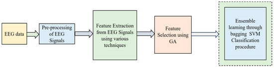 The extracted features included wavelet transforms, Fast Fourier transforms (FFTs), fractal dimension, mobility, peak amplitude, complexity, zero crossing, variance, frequency band power, skewness, mean, kurtosis, correlation coefficient, average spectral power, entropy, energy, line length, detrend fluctuation analysis, absolute value sum, Hurst exponent, entropy, amplitude, etc. The Ensemble hybrid model with GA-based feature selection and bagging SVM-based classification model is shown in Figure 3.