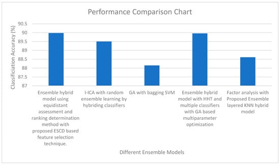 Figure 6 shows the performance comparison of various ensemble models. It is quite evident from Figure 6 that the highest classification accuracy is obtained by the ensemble hybrid model using the equidistant assessment and ranking determination method with the ESCD-based feature selection technique. The second highest classification accuracy is obtained by the ensemble hybrid model with HHT and multiple classifiers with GA-based multiparameter optimization. The lowest classification accuracy is obtained by the GA with the bagging SVM classifier. Table 6 shows the performance comparison of the current work with the results of the previous works.