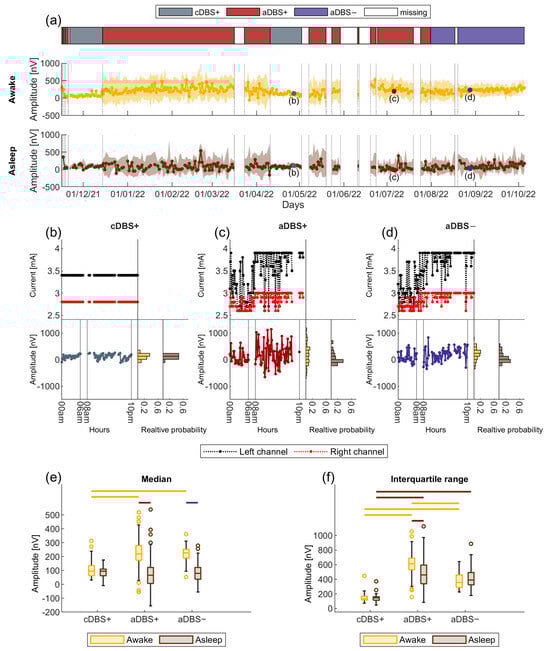 Beta amplitude modulations in aDBS than in cDBS. (a) Evolution of the daily median BFRA (solid line) during awake (yellow) and asleep (brown) time. The shadowed area is bound by the daily first and third quartile of the BFRA. Vertical dotted lines represent the time points in which the treatment condition changed, as displayed in the legend on top. Grey, dark red, and purple dots mark the representative days shown, respectively, in (b–d). (b) A representative day in cDBS+. Top left: daily evolution of the stimulation current for the left (black) and right (red) STN. Bottom left: daily evolution of the BFRA. Awake (8 a.m.–10 p.m.) and asleep (midnight to 6 a.m.) periods are separated by vertical solid lines. Bottom right: distribution of the BFRA separately for the awake (yellow) and asleep (brown) period. (c) Same as (b) for a representative day in aDBS+. (d) Same as (b) for a representative day in aDBS−. On these three days (b–d), the total electrical energy delivered (TEED) was comparable (values reported in W. Left STN, cDBS+: 1.2 × 10−4, aDBS+: 1.3 × 10−4, aDBS−: 1.3 × 10−4; right STN, cDBS+: 1.1 × 10−4, aDBS+: 1.1 × 10−4, aDBS−: 1.1 × 10−4). In aDBS mode, the TEED was calculated every minute and then averaged across the day. (e) Boxplot of the daily median BFRA during awake (yellow) and asleep (brown) time in cDBS+, aDBS+, and aDBS−. Top horizontal lines define significant differences (solid line: p < 0.001, significance set at 0.05). (f) Same as (e) for the interquartile range of the BFRA. Abbreviations: a, adaptive; BFRA, amplitude of the STN-LFP in the patient-specific beta frequency range; c, conventional; DBS, deep brain stimulation; DBS+, with dopaminergic medication; DBS−, without dopaminergic medication; LFP, local field potential and STN, subthalamic nucleus.