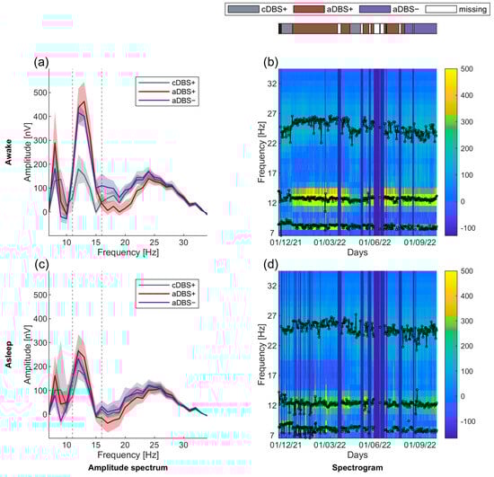 Long-term stable beta-band peak frequency. (a) Median (solid line) of the daily mean amplitude spectra throughout the 11 months of recording in the three treatment conditions (cDBS+ in grey, aDBS+ in dark red, and aDBS− in purple) during awake time. The dashed area is bound by the first and third quartiles of the daily mean amplitude spectra. (b) Spectrogram of daily mean amplitude spectra during awake time. Blue vertical lines correspond to missing or removed data periods due to residual spectral artifacts after neural power law component removal (see Section 2). Black lines on top of the spectrogram represent the time course of the central frequency of the three Gaussian peaks identified in each daily mean amplitude spectrum during awake time. (c) Same as (a) during asleep time. (d) Same as (b) during asleep time. Abbreviations: a, adaptive; c, conventional; DBS, deep brain stimulation; DBS+, with dopaminergic medication and DBS−, without dopaminergic medication.