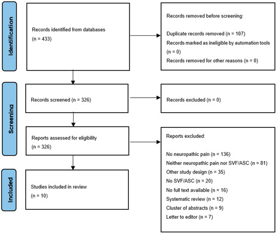 Studies were considered eligible if the efficacy of adipose tissue-derived components, i.e., adipose tissue, lipoaspirate, SVF or ASCs, was therapeutically tested for neuropathic pain in a clinical study. The exclusion criteria included no availability of the full-text article or English translation, (systematic) reviews, case reports, case series, letters to the editor, conference abstracts and animal and in vitro studies.