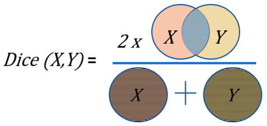 The metric to measure the reliability of the segmentation results is the Sorensen–Dice Coefficient (‘dice score’) [41]. A dice value of 100 (in percentage) means that the predicted mask is exactly like the target mask. The definition of dice score is given by the following formula, where X and Y are the two masks to be compared: