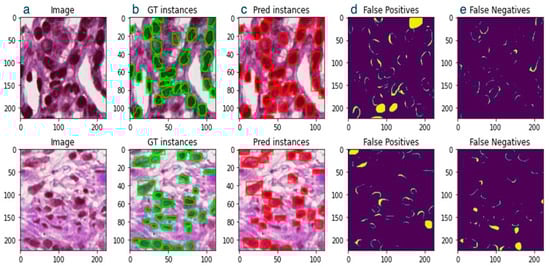 Two example analyses of a patch, (left to right). (a) Image, (b) ground truth instances (green bounding box + mask), (c) predicted instances (red bounding box + mask), (d) false positives, (e) false negatives.