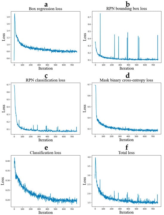 Loss convergence plots. (a) The box regression loss, (b) the RPN bounding box loss, (c) the RPN classification loss, (d) the mask binary cross-entropy loss, (e) the classification loss, (f) the total loss.