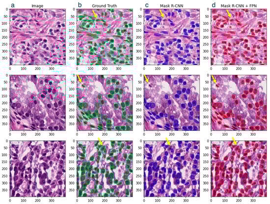 Three examples of visualizing nuclei. (a) Input image of H&E-stained tissue, (b) ground truth instance, (c) predicted instance using Mask R-CNN, (d) predicted instance using Mask R-CNN + FPN. The yellow arrows show examples of improved detection.