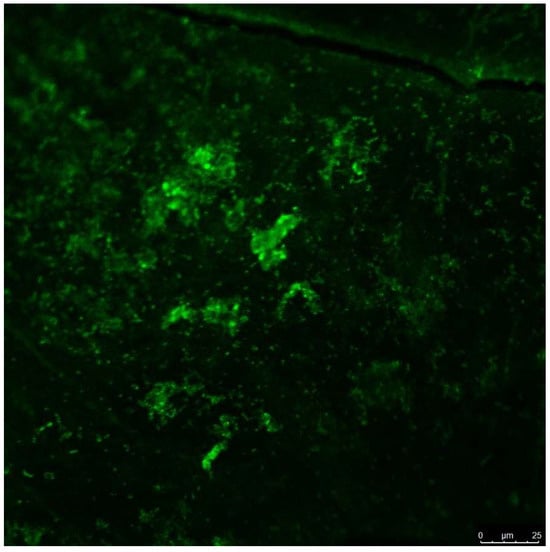 The samples were then covered with 10 µL staining solution consisting of 1 mL 0.9% NaCl, 1 µL SYTO 9, and 1 µL propidium iodide and incubated for 15 min in the dark at 25 °C. After staining, the samples were gently irrigated with saline. The green dye binds to the cell wall of living bacteria, while the red dye binds to the damaged bacteria cell wall. Consequently, the samples were analyzed using a confocal laser microscope (Leica TSC SP8; Leica Microsystems GmbH, Wetzlar, Germany). Randomly chosen surfaces on the sample were taken into consideration, and four micrographs per specimen were taken. The analysis was performed by an individual who was blinded to the preceding sample treatment.