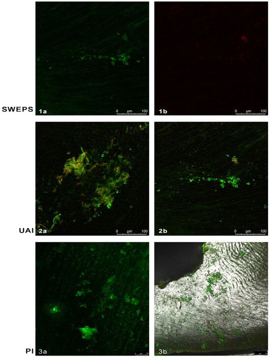 Confocal laser scanning microscopy of representative dentine discs with Enterococcus faecalis (E. faecalis) biofilm after the irrigation protocols: (1a,1b). SWEEPS: a few areas adhered to living E. faecalis colonies (green) are observed, as well as several areas where dead bacteria accumulated (red) (b) and a large area of clean dentin; (2a,2b). Ultrasonically activated irrigation (UAI): areas with dead colonies (red) of E. faecalis, and significant areas of live bacteria colonies still (green); (3a,3b). Passive irrigation (PI): large areas of live E. faecalis bacteria colonies (green).