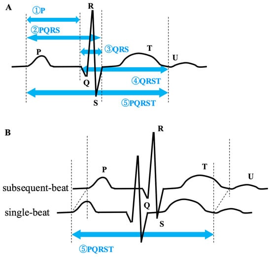 - Partial ECG: From a single-beat ECG, five types of partial ECGs were created, demarcated by the data points 100 ms before the QRS, at the ST junction, and at the end of the T-wave, including ① P, ② PQRS, ③ QRS, ④ QRST, ⑤ PQRST (Figure 2). Based on the single-beat ECG data, the partial ECGs were segmented as follows: the boundary between the P-wave and QRS complex was defined as 100 ms before the detected QRS complex. The end of the QRS complex and the T-wave was also detected using the Ngaia™ programme.