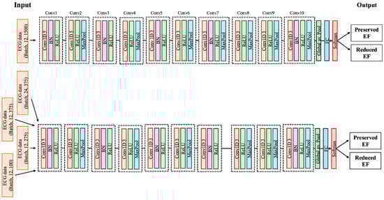 The convolutional neural network (CNN) architecture used in this study is illustrated in Figure 3. The model developed for analysing single-beat ECGs was a one-dimensional CNN comprising multiple blocks. Each block consisted of a one-dimensional convolution, batch normalisation, a ReLU activation function, and a max pooling operation. The last layer included a fully connected layer and softmax function to estimate the probabilities of the following two diagnostic categories: pEF and reduced LVEF. The detailed explanation on the model architecture was given in the Supplementary Materials. For the model analysing double-beat ECGs, the same CNN architecture was employed with an increased number of input channels. All analyses were conducted using Python 3.10 and PyTorch 2.0.