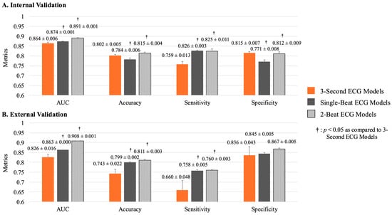 Performance of 3 s ECG and beat-wise ECG models. Performance comparisons of the 3 s ECG, single-beat ECG, and 2-beat ECG models are presented. (A) During internal validation, the two-beat ECG models outperformed the other two models. The single-beat ECG models exhibited superior performance regarding AUC and sensitivity, whereas the 3 s ECG models demonstrated superior accuracy and specificity. (B) During external validation, the two-beat ECG models again outperformed the other two models. The single-beat ECG models showed superior performance compared to the 3 s ECG models. ECG, electrocardiogram; AUC, area under the curve.